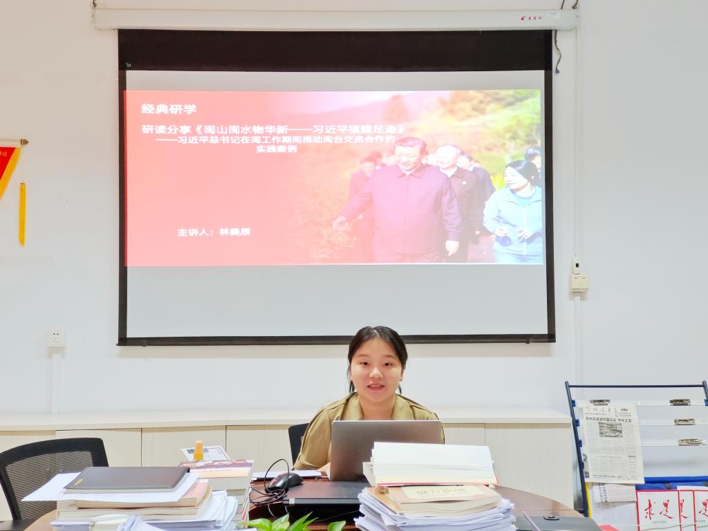 活動中,林美辰從《閩山閩水物華新——習近平福建足跡》中關于習近平總書記在閩工作期間推動閩臺交流合作的實踐案例進行研學分享,指出學習習近平總書記在閩工作期間推動閩臺交流合作的實踐案例有助于我們深入學習貫徹黨的二十大精神和新時代黨解決臺灣問題的總體方略,具有重要的理論意義和時代意義。