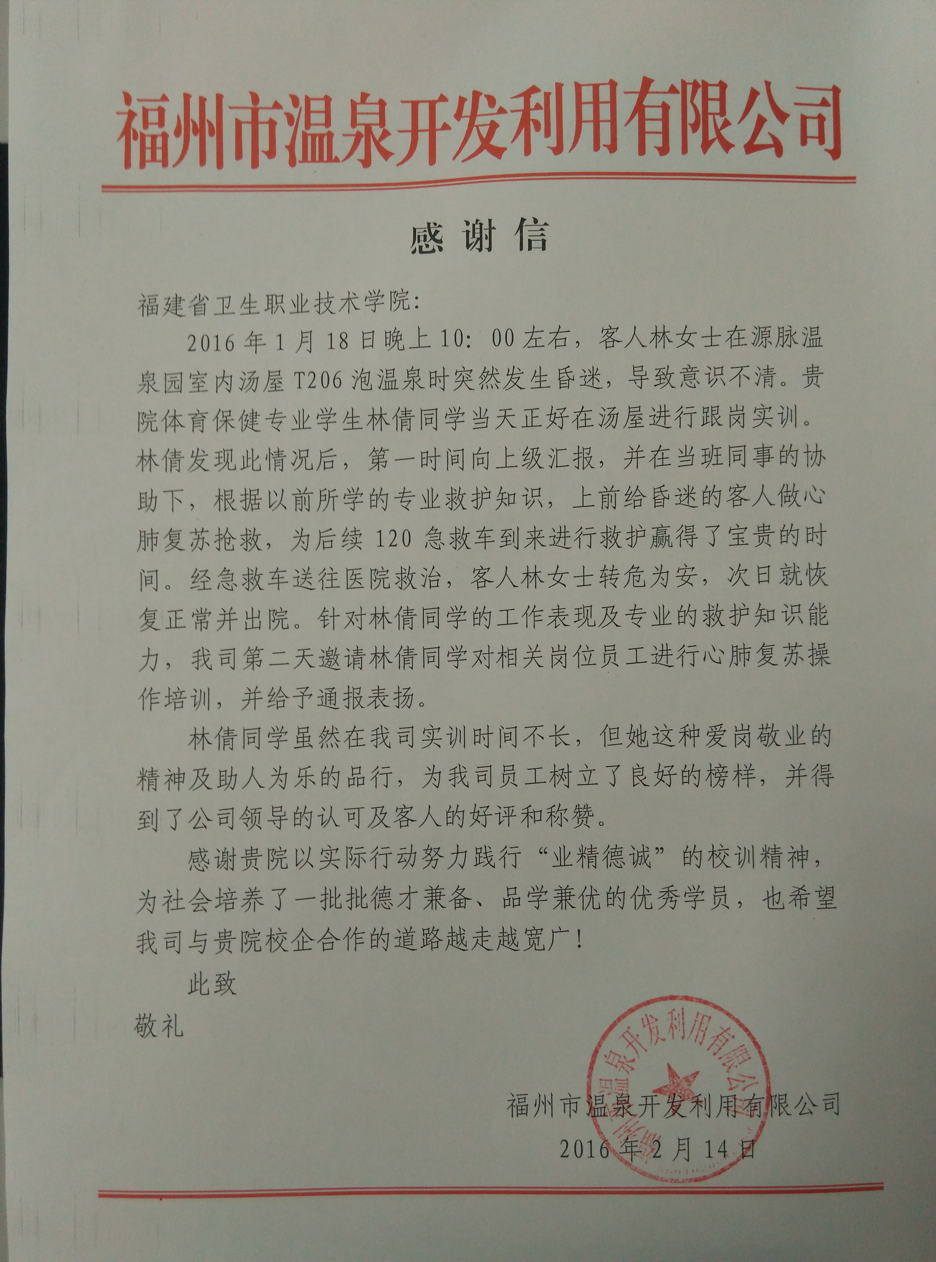 我院公共基礎部14體育保健301班林倩同學2016年1月18日在福州源邁溫泉園跟崗實訓時發現客人林女士突然發生昏迷,意識不清,林倩同學第一時間向上級匯報,利用所學專業救護知識,迅速給昏迷的客人進行心肺復蘇搶救,為后續120急救車到來進行救護贏得了寶貴的時間,經急救車送往醫院救治,客人林女士轉危為安。2月26日,學院收到福州市溫泉開發利用有限公司寄來的表揚信。