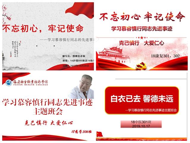 我校全體輔導員在10月17日參加學院隆重舉行的“不忘初心、牢記使命”主題教育之身邊先進典型學習活動——慕容慎行同志先進事跡報告會后,受慕容慎行同志作為人民好醫生、人民好教師的崇高品格和精神風貌所感染,及時積極將學習精神通過開展學習慕容慎行先進事跡主題班會的形式傳達給學生們。在10月20日晚的輔導員班會課上,輔導員們備上報告會錄像資料和各自認真準備的PPT等班會資料,為學生們傳達“慕容”精神。