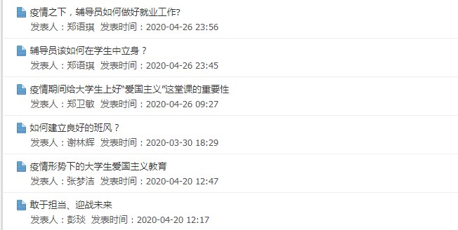 學習過程中,輔導員們還圍繞“如何做好疫情期間青年學生的愛國主義教育”“如何建立良好的班風”“疫情期間如何繼續提升大學生職業競爭力”等主題積極開展網絡集中研討,學習交流同分享,攜手同行共成長。