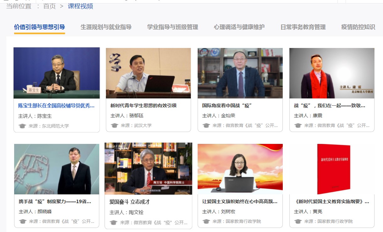 本次培訓活動分為課程學習、主題研討、心得撰寫、直播答疑等四個環節,課程涵蓋“價值引領與思想引導”“生涯規劃與就業指導”“學業指導與班級管理”“日常事務教育管理”“心理調適與健康維護”“疫情防控知識”六大模塊,課程體系全。
