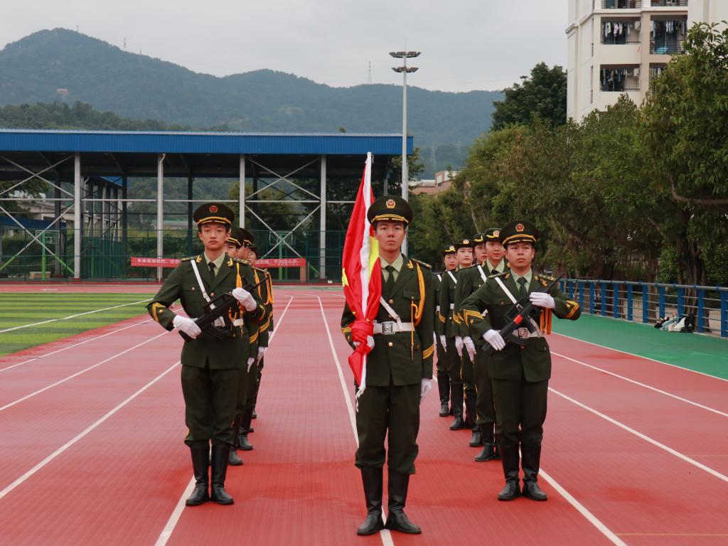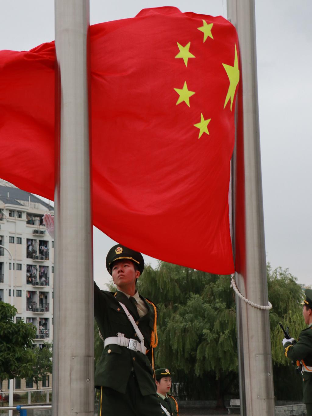 隨著國旗護衛隊矯健有力的步伐,雄壯的國歌聲響起,典禮正式拉開序幕。向著秋雨洗禮過后的清空,五星紅旗冉冉升起,全體師生向國旗敬禮。