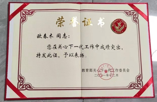 12月22日,教育部關(guān)心下一代工作委員會(huì)召開第六次工作會(huì)議暨成立30周年紀(jì)念大會(huì),對(duì)全國教育系統(tǒng)關(guān)心下一代工作先進(jìn)集體、先進(jìn)工作者和突出貢獻(xiàn)者進(jìn)行通報(bào)表揚(yáng)。我校關(guān)工委榮獲“全國教育系統(tǒng)關(guān)心下一代工作先進(jìn)集體”榮譽(yù)稱號(hào),我校離退休黨總支書記、藥學(xué)院關(guān)工委副主任歐春木榮獲“全國教育系統(tǒng)關(guān)心下一代工作先進(jìn)工作者”榮譽(yù)稱號(hào)。