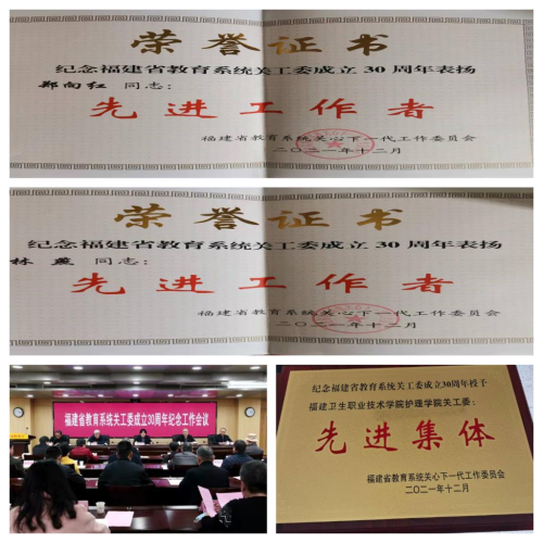 虎年新春即將到來之際,我校育人工作再傳喜訊。在1月26日召開的福建省教育系統關工委成立30周年紀念工作會議上,我校護理學院關工委榮獲“福建省教育系統關心下一代工作先進集體”榮譽稱號,健康管理系關工委常務副主任鄭向紅,醫學技術系黨總支副書記、系關工委秘書長林燕獲得“福建省教育系統關心下一代工作先進工作者”榮譽稱號。