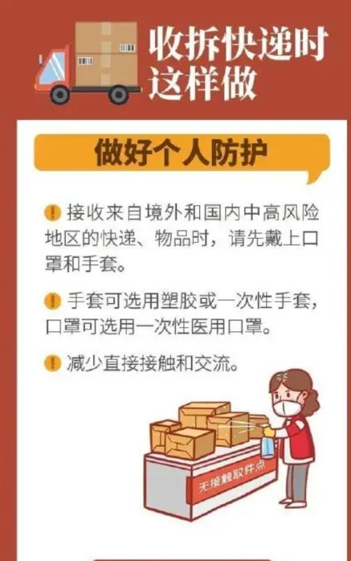 減少不必要網購,特別是不從中高風險區與國(境)外購物。在接收快遞時,應全程佩戴口罩,建議先對外包裝進行消毒,或者放置在通風有陽光處靜置一段時間后再開包使用,拆包后的垃圾應按垃圾分類處理。處理完畢后,清洗消毒雙手。如接收到涉疫快遞,應主動報告輔導員,并配合排查工作。