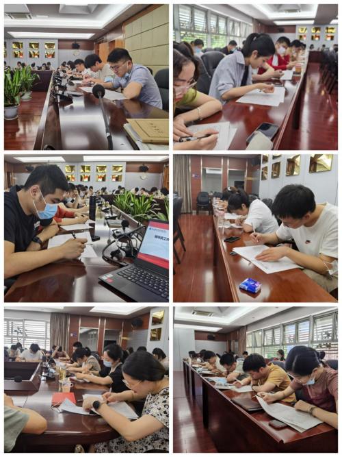 為切實提高講座的實效性,會前,學生工作部組織全體專職輔導員進行基礎業務知識測試。本次測試作為二級院系選拔的重要環節,采用閉卷的方式,內容主要涵蓋了思想政治教育理論知識、黨史知識、輔導員業務素質、心理健康教育知識、疫情防控等內容,包括單選題、不定項選題、簡答題、對策分析題,旨在全面考察輔導員的業務水平和綜合素質。學生工作部安排專人監考,副校長黃銘珊來到測試現場巡考。