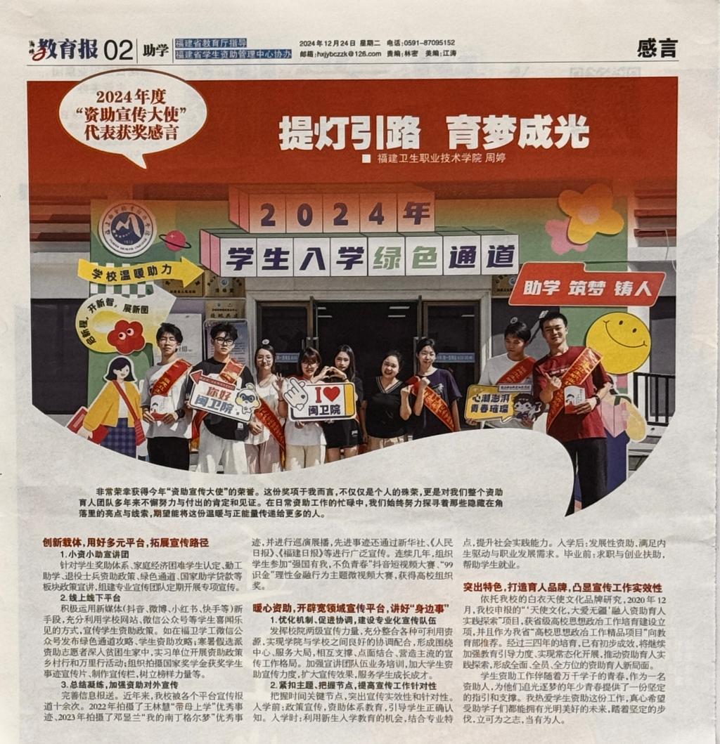 學生工作部周婷以“資助宣傳大使”的身份,在海峽教育報分享《提燈引路,育夢成光》工作感言。