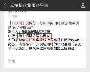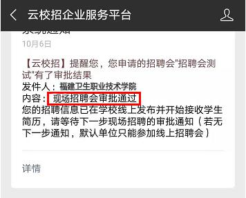 就業中心集中審核校園招聘會報名申請,原則上在規定時間內報名的用人單位,資質審核合格的,都能獲得線上招聘資格,最終的現場招聘單位名單確定將依據學校的實際情況和畢業生的求職需求,審核結果將通過企業微信端(云校招企業服務平臺)通知單位聯系人,審核結果分兩類: