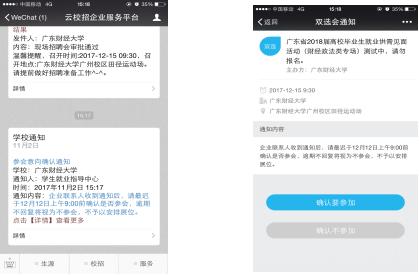 請企業聯系人務必綁定并登錄“云校招”微信公眾號,以免接收不到相關通知。企業聯系人系統默認為登錄我院學生就業指導中心官網的賬號(手機號碼)聯系人。