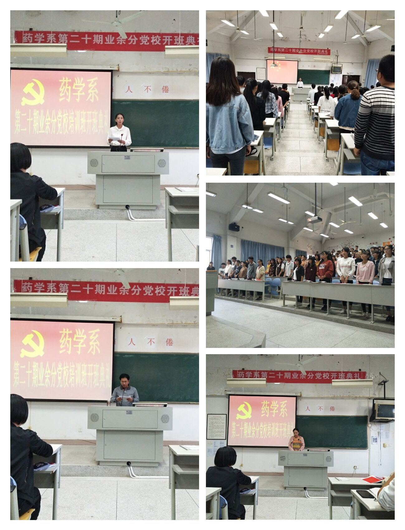 2017年11月2日,藥學系在藥二階隆重召開第二十期業余分黨校開班典禮,蒞臨本次大會的領導老師有:黨總支陳潔副書記,黨總支委員、系副主任李泳寧博士,黨總支委員葉雅沁老師,第一黨支部書記郭丹老師,第二黨支部書記何舒瀾老師,學生黨支部書記蘇素嬌老師以及全體輔導員。
