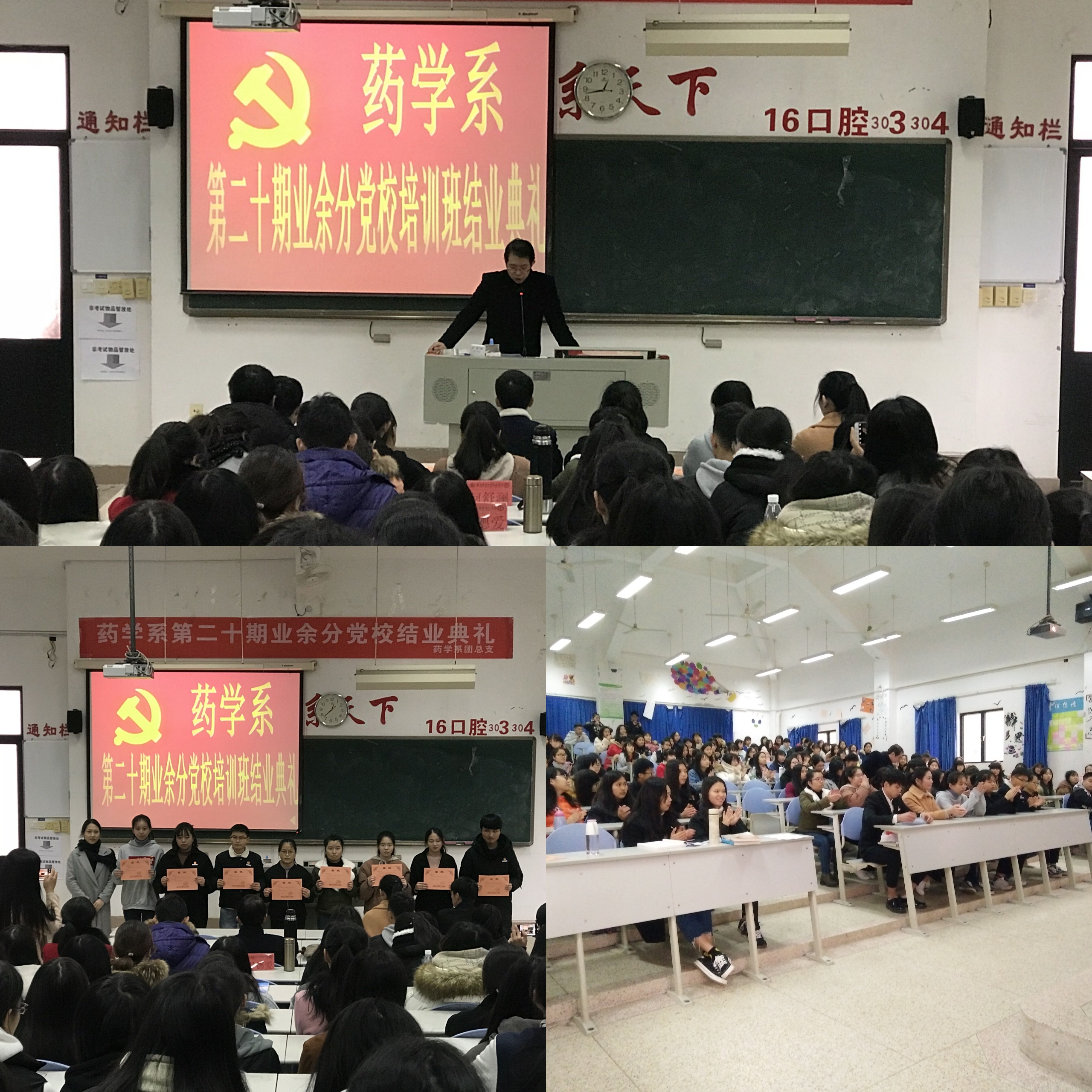 2018年1月30日,藥學系第二十期業余分黨校結業典禮在教學樓310隆重舉行。本期的業余黨校從12月開班,歷時一個多月,總支書記、副書記及支部書記分別為學員們帶來了5堂深入淺出的黨課。黨課從黨的歷史、中國為什么選擇了中國共產黨、胸懷祖國放眼世界,堅定信念做民族脊梁、社會主義核心價值觀、端正入黨動機、十九大報告等多方面多角度,闡述了黨的基本知識、發展歷程、歷史賦予共產黨的使命、當前國家發展的形勢,也分別對同學們寄予了不同的期望和要求。