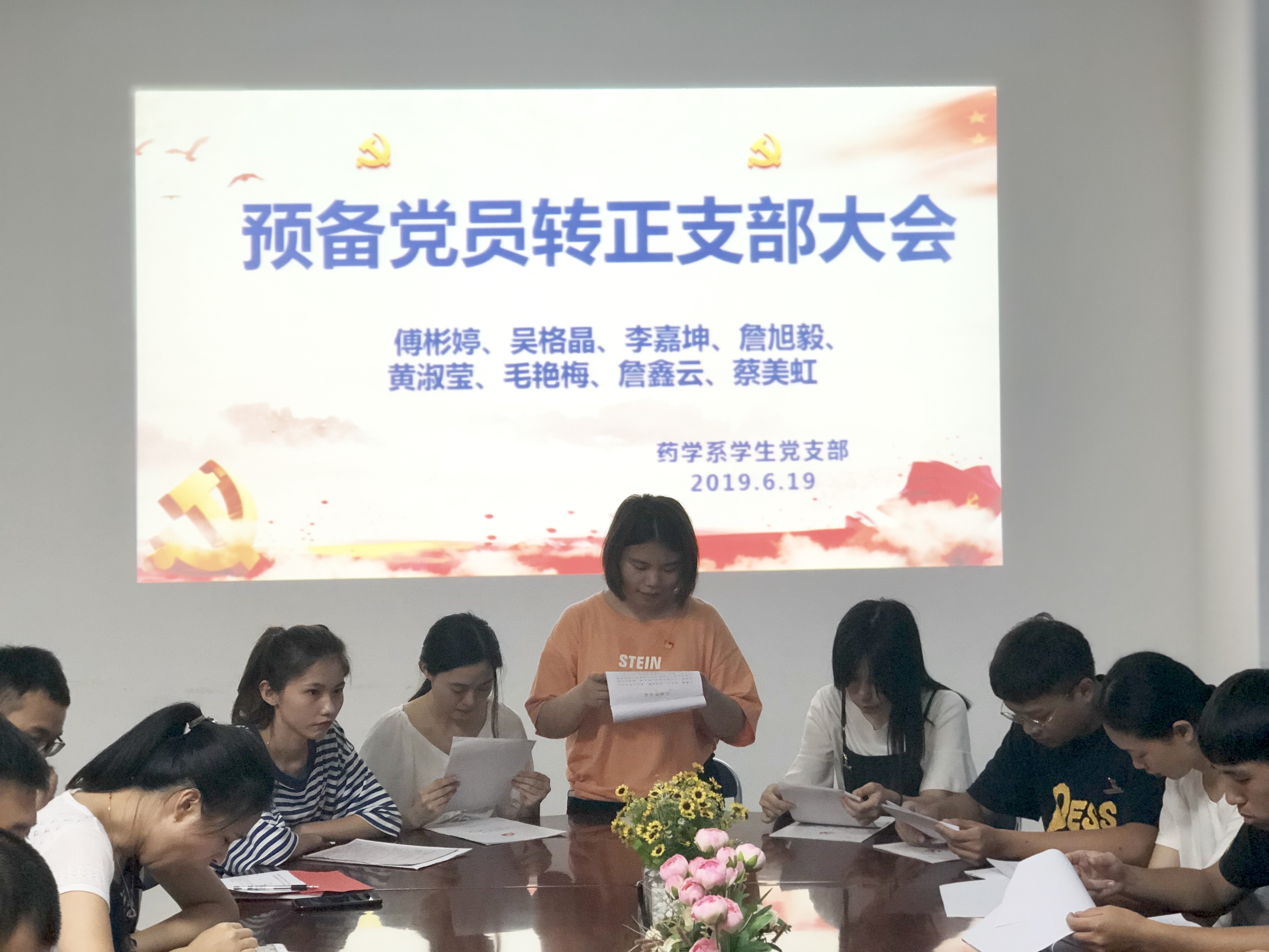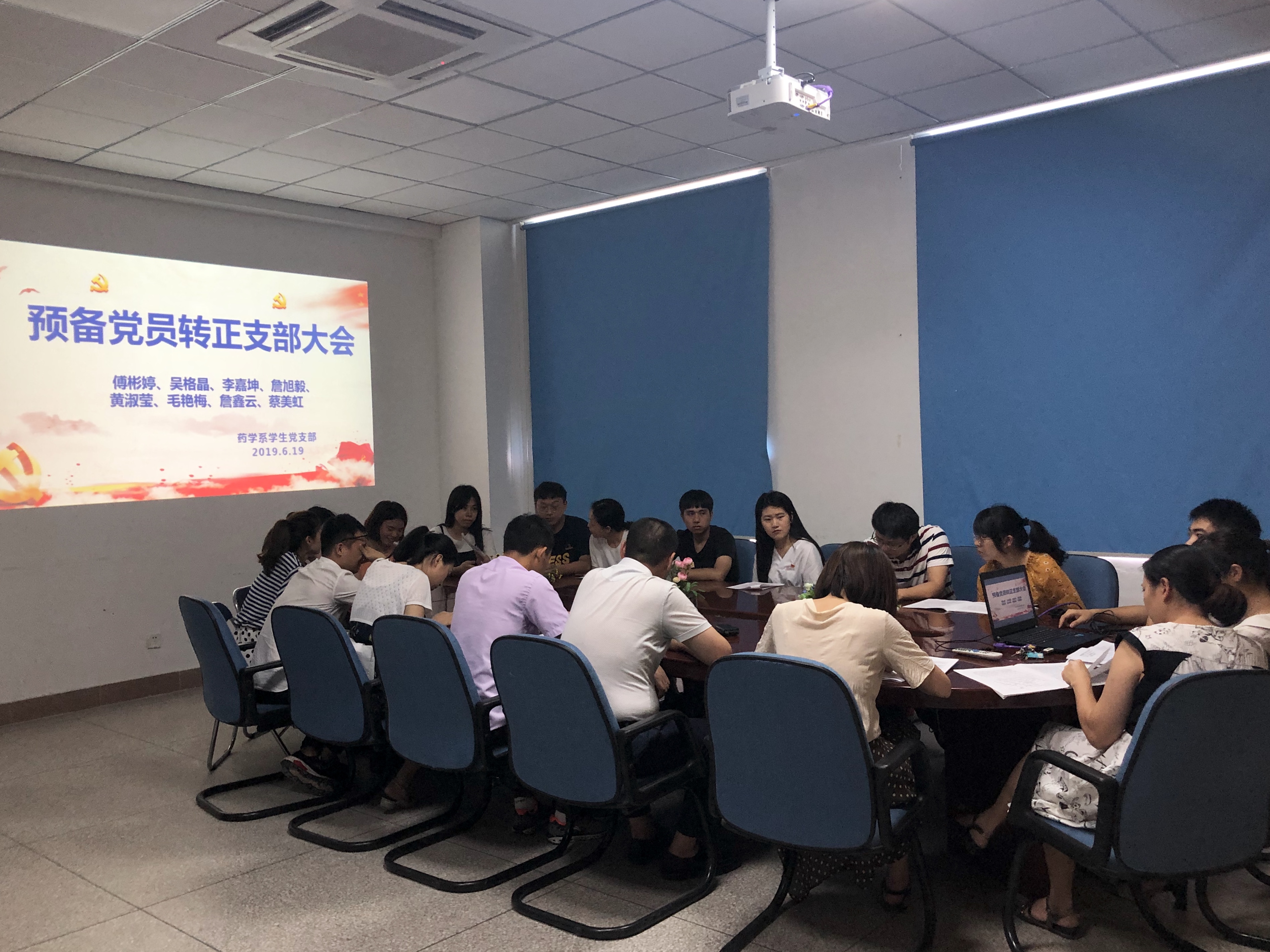 2019年6月19日上午,藥學系學生黨支部在藥學系207會議室召開預備黨員轉正大會。會議由支部書記蘇素嬌同志主持,支部10名正式黨員同志及8名學生預備黨員參會。