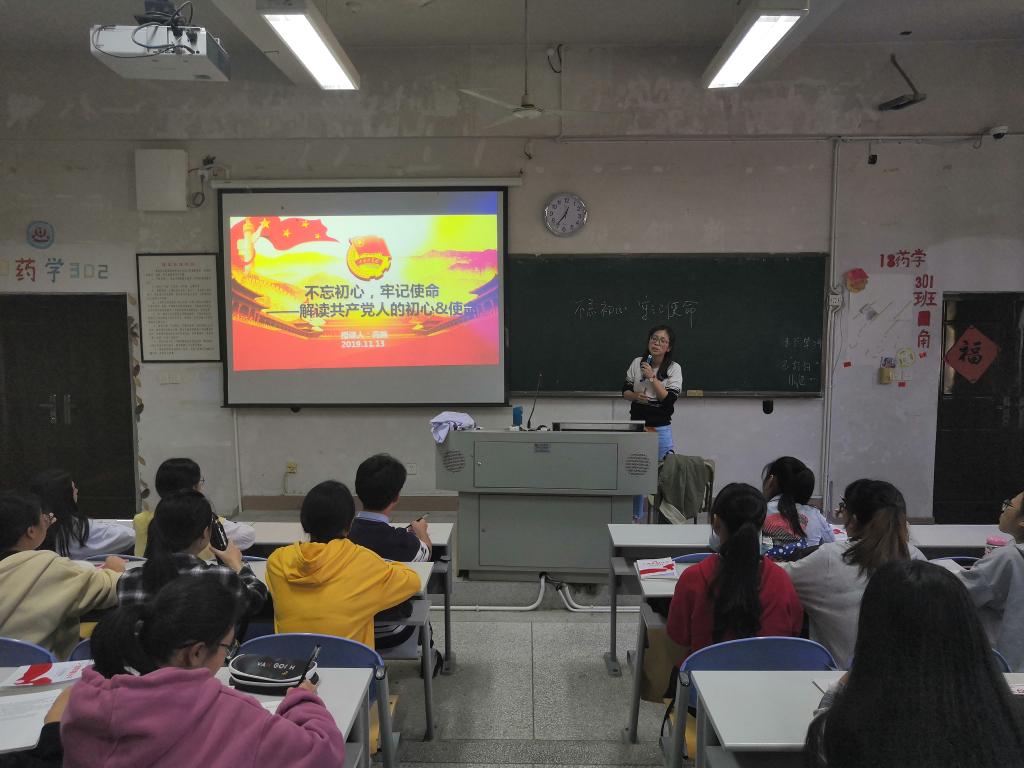 11月13日,藥學(xué)系黨總支在藥一階為本期業(yè)余分黨校學(xué)員講授主題為“解讀共產(chǎn)黨人的初心與使命”專題黨課,由學(xué)生黨支部高施老師主講。