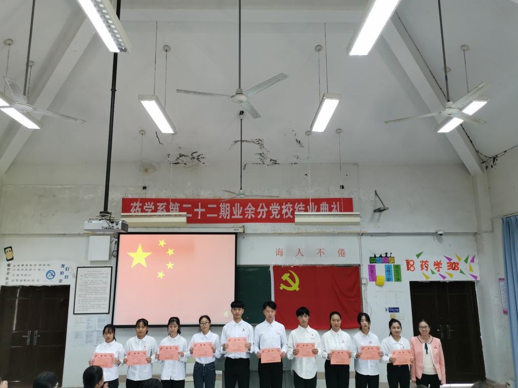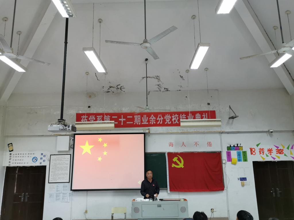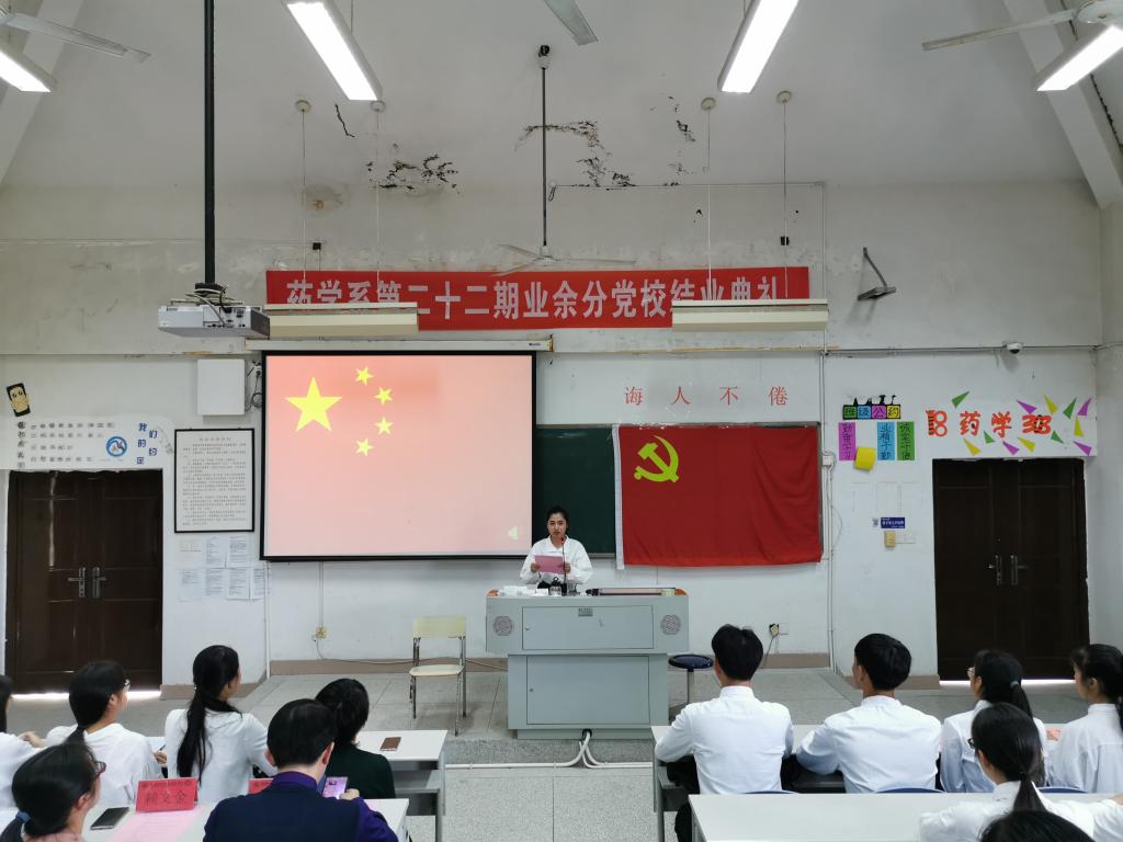 2019年11月21日,藥學系黨總支于藥二階隆重召開第二十二期業余分黨校結業典禮。藥學系黨總支書記鄭力宏、黨總支副書記賴文金、副主任潘雪豐、黨總支專職組織員黃嵩梅、各支部書記、全體輔導員到場參加。