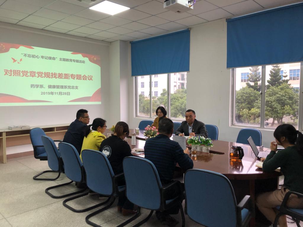 11月28日,藥學系黨總支在系部會議室召開“不忘初心、牢記使命”主題教育對照黨章黨規找差距專題會議。學院紀委書記、第四巡回指導組組長游鋒及巡回指導組成員護理系黨總支專職組織員許慧瓊列席專題會,藥學系黨總支書記鄭力宏主持會議。