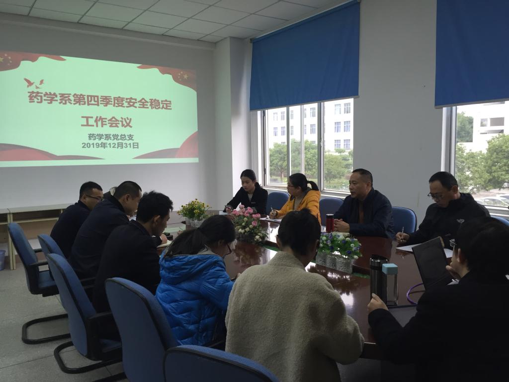 2019年12月31日,藥學系黨總支在系部會議室召開第四季度安全穩定工作會議,藥學系黨總支書記鄭力宏、副主任(主持工作)肖健、黨總支副書記賴文金、副主任潘雪豐、總支委員、各支部書記、教研室主任、實訓中心主任及全體輔導員到場參會,會議由黨總支書記鄭力宏主持。
