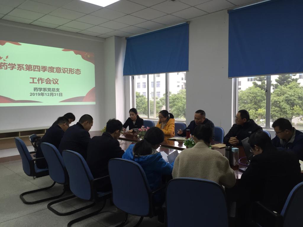 2019年12月31日,藥學系在系部會議室召開第四季度意識形態工作會議,藥學系黨總支書記鄭力宏、副主任(主持工作)肖健、黨總支副書記賴文金、副主任潘雪豐、總支委員、各支部書記、教研室主任、實訓中心主任及全體輔導員到場參會,會議由黨總支書記鄭力宏主持。