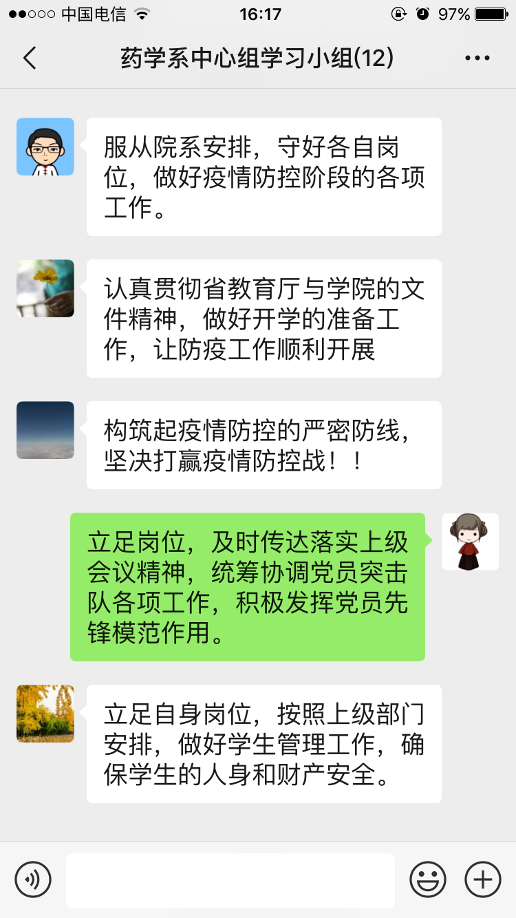 2020年2月20日,藥學系黨總支在微信群召開中心組學習(擴大)會議,集中學習近期省委教育工委以及學院關于疫情防控工作的相關決策部署,會議由藥學系黨總支書記鄭力宏主持。