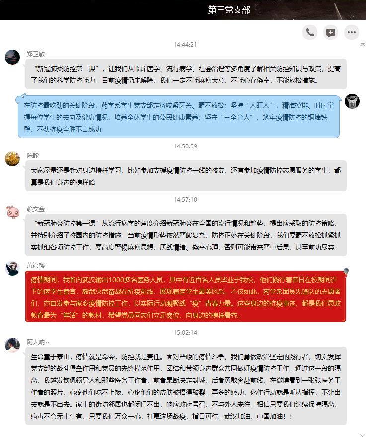 2月24日下午,就當日上午開講的復旦大學“新冠肺炎防控第一課”,藥學系學生黨支部組織全體師生黨員,通過QQ線上學習形式,集體學習防控重點、交流學習心得。