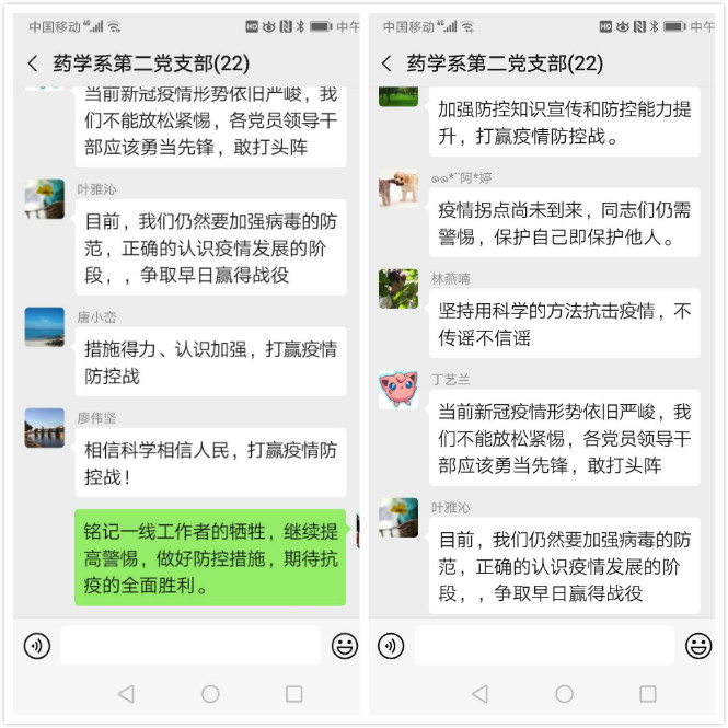 隨后,支部黨員結合個人工作實際展開發言。大家紛紛表示要致敬前線醫療行業的勇士們,牢記入黨誓詞,充分發揮黨員的先鋒模范作用,立足本職崗位,積極參與院系疫情防控工作,做到不負初心,不負誓言!