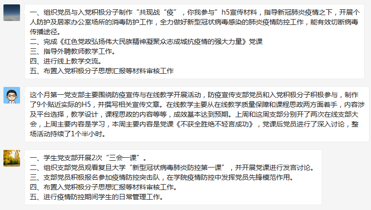 會上,各支部書記詳細匯報了2月份各項工作開展情況。第一、第二黨支部本月主要圍繞防疫知識宣傳與在線教學開展活動,聯合入黨積極分子共同制作系列防疫科普知識H5宣傳材料,在線教學主要從在線教學質量保障和課程思政兩方面著手,成效基本達到預期。學生黨支部本月側重疫情期間學生管理工作,認真落實學生“每日一報”信息,并聯合團學開展系列防疫宣傳活動。在認真聽取各支部工作匯報后,系總支集體審閱2019年度藥學系各支部達標創星情況,并根據各支部自評情況開展五星黨支部推薦工作。