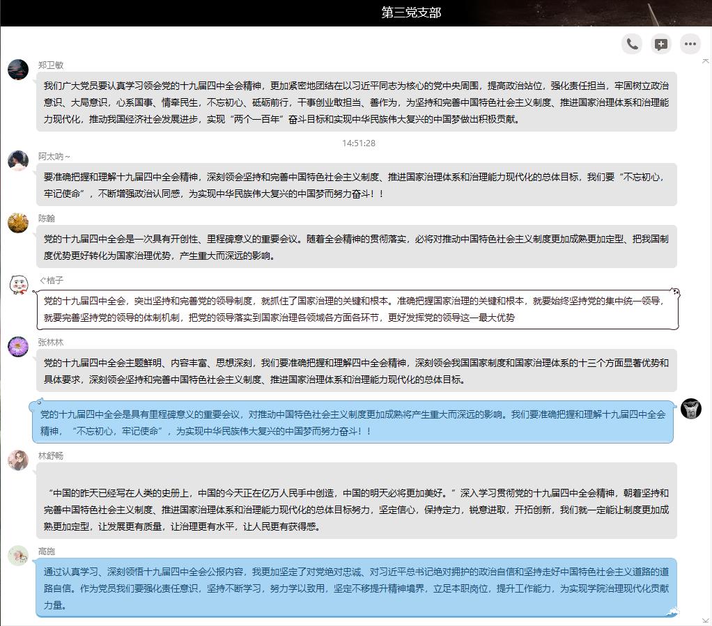 為更好地學(xué)習(xí)貫徹黨的十九屆四中全會(huì)精神、更深刻地理解新時(shí)代中國(guó)特色社會(huì)主義內(nèi)涵、致力國(guó)家治理體系和治理能力現(xiàn)代化事業(yè)發(fā)展,3月5日下午,藥學(xué)系學(xué)生黨支部通過QQ平臺(tái)開展線上主題黨日活動(dòng),集體學(xué)習(xí)黨的十九屆四中全會(huì)審議通過的《中共中央關(guān)于堅(jiān)持和完善中國(guó)特色社會(huì)主義制度 推進(jìn)國(guó)家治理體系和治理能力現(xiàn)代化若干重大問題的決定》全文。