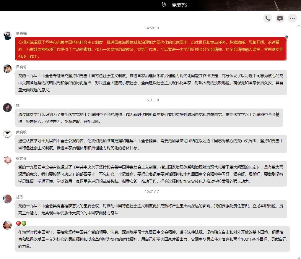 通過本次集中學(xué)習(xí),支部全體黨員的思想覺悟再一次接受洗禮,全體師生黨員紛紛表示,作為黨務(wù)工作者、思政教師、學(xué)生代表,定將按照《決定》的部署要求,不忘初心、牢記使命,把全會(huì)精神、《決定》精神學(xué)習(xí)好、領(lǐng)會(huì)好、貫徹好,堅(jiān)持學(xué)思踐悟、學(xué)通弄懂、學(xué)以致用,真正用先進(jìn)思想武裝頭腦、指導(dǎo)實(shí)踐、推動(dòng)學(xué)習(xí)工作,為國(guó)家治理體系和治理能力現(xiàn)代化建設(shè)貢獻(xiàn)力量。