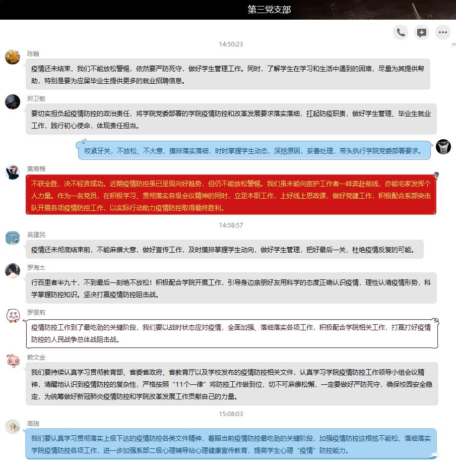 學習過程中,在習近平總書記3月4日中共中央政治局常務委員會會議上的重要講話、省委常委會(擴大)會議暨應對新冠肺炎疫情工作領導小組第十八次會議等精神指引下,支部陳翰書記詳細闡讀了我院院領導在學院疫情防控工作領導小組第六次會議暨黨委中心組學習擴大會議上的重要指示,尤其強調針對學生工作實際,如何在信息應用、渠道暢通、依法治校等三個方面切實踐行服務學生初心及如何關注并做好就業、招生、特殊群體服務等方面的學院部署。陳翰書記借用學院黨委曾武祈書記的講話,強調所有學生工作者及先進學生代表一定要增強必勝之心、責任之心、仁愛之心、謹慎之心“四心”,做好宣傳教育、做優抗疫氛圍,提高政治站位,確保疫情期間各項學生工作落地見效。