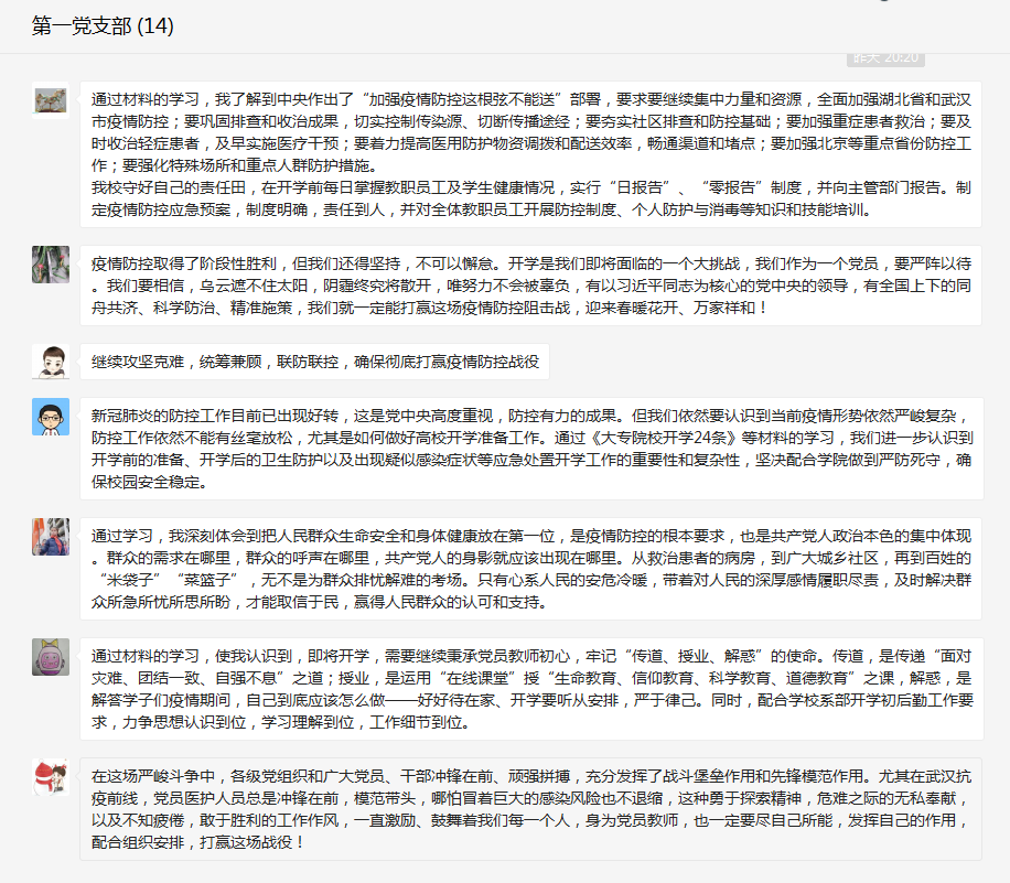 本次學習了《習近平:在統籌推進新冠肺炎疫情防控和經濟社會發展工作部署會議上的講話》、《習近平:全面提高依法防控依法治理能力 健全國家公共衛生應急管理體系》、《省委常委會召開會議研究2019年全面從嚴治黨主體責任落實情況,部署安全生產和應急管理、軍民融合發展等工作》、《大專院校開學24條》以及相關評論文章等7個學習材料,本次學習內容豐富、注重實效,為了加強學習效果、提高學習效率、保證學習質量,支部采取提前發布學習內容,黨員同志提前熟悉學習材料,做好學習筆記,會上黨員同志圍繞學習內容交流心得體會的形式,充分開展學習交流。