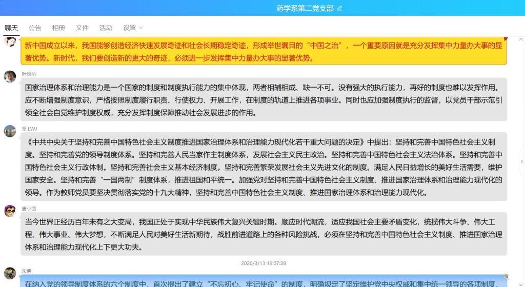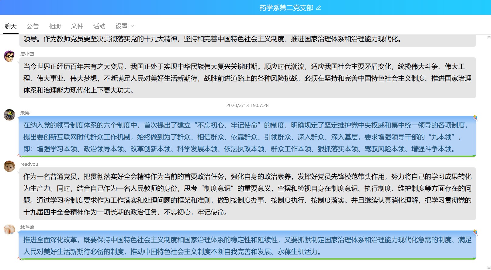 3月13日,為深入學習貫徹黨的十九屆四中全會精神,進一步做好疫情防控工作,藥學系第二黨支部通過微信群開展我學黨的十九屆四中全會線上主題黨日活動。