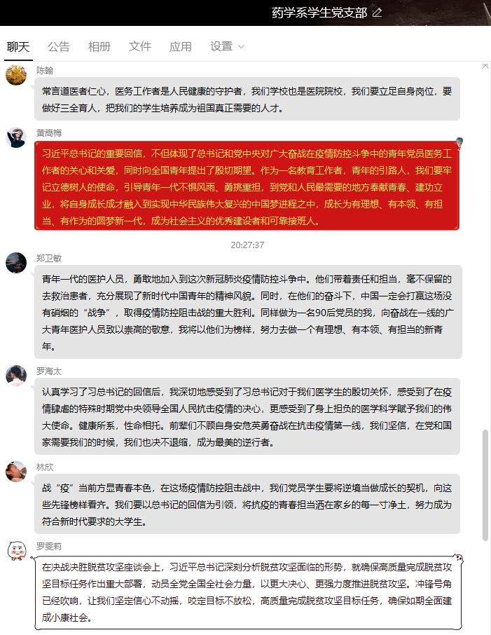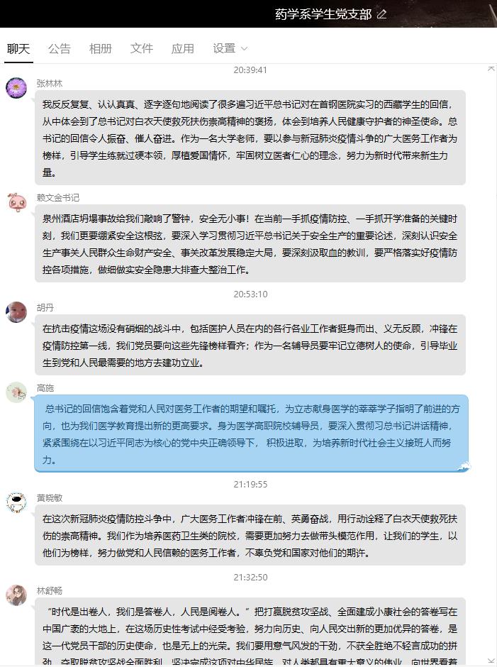 在一手抓疫情防控、一手抓開學(xué)準(zhǔn)備的關(guān)鍵時(shí)刻,3月21日晚,藥學(xué)系學(xué)生黨支部通過QQ平臺集中學(xué)習(xí)中共中央辦公廳《黨委(黨組)落實(shí)全面從嚴(yán)治黨主體責(zé)任規(guī)定》《新時(shí)代高等學(xué)校思想政治理論課教師隊(duì)伍建設(shè)規(guī)定》,習(xí)近平總書記給在首鋼實(shí)習(xí)的西藏學(xué)生的回信、在脫貧攻堅(jiān)座談會上的講話等文件及我省關(guān)于泉州市欣佳酒店坍塌事故處置和安全隱患大排查大整治的省委常委會會議精神。