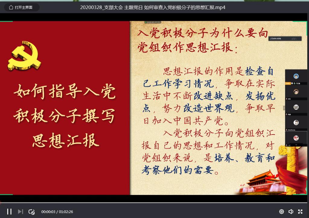 3月29日,藥學(xué)系第一黨支部以《如何指導(dǎo)入黨積極分子撰寫思想?yún)R報》為題,在騰訊會議APP開展線上主題黨日活動。