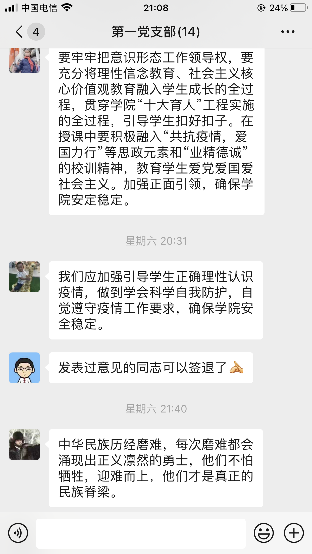 最后,學(xué)院紀(jì)委書記游鋒作會(huì)議總結(jié),他強(qiáng)調(diào)我們要充分認(rèn)識(shí)到意識(shí)形態(tài)主陣地的意義,加強(qiáng)正面引領(lǐng),教育學(xué)生愛黨愛國(guó)愛社會(huì)主義。中華民族歷經(jīng)磨難,每次磨難都會(huì)涌現(xiàn)出正義凜然的勇士,他們不怕犧牲,迎難而上,2020年的清明節(jié),我們深切緬懷每一位犧牲在抗疫一線的勇士,同時(shí)也衷心祈愿疫情盡早結(jié)束,大家抖擻精神,整裝出發(fā)。