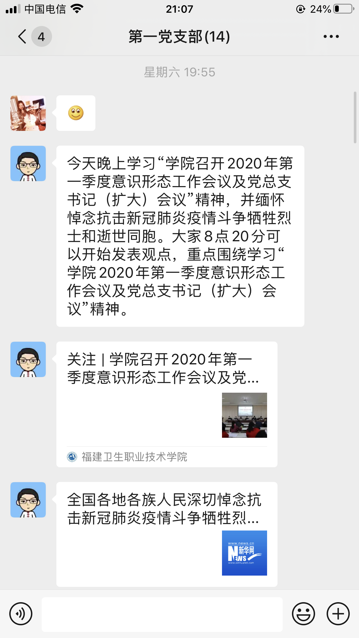 4月4日,藥學(xué)系第一黨支部在線集中學(xué)習(xí)傳達(dá)了“學(xué)院2020年第一季度意識(shí)形態(tài)工作會(huì)議及黨總支書記(擴(kuò)大)會(huì)議”精神。