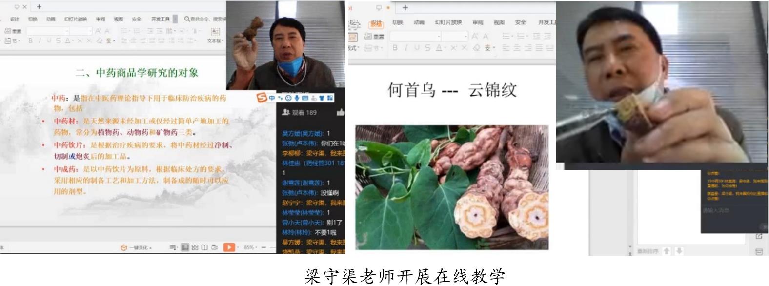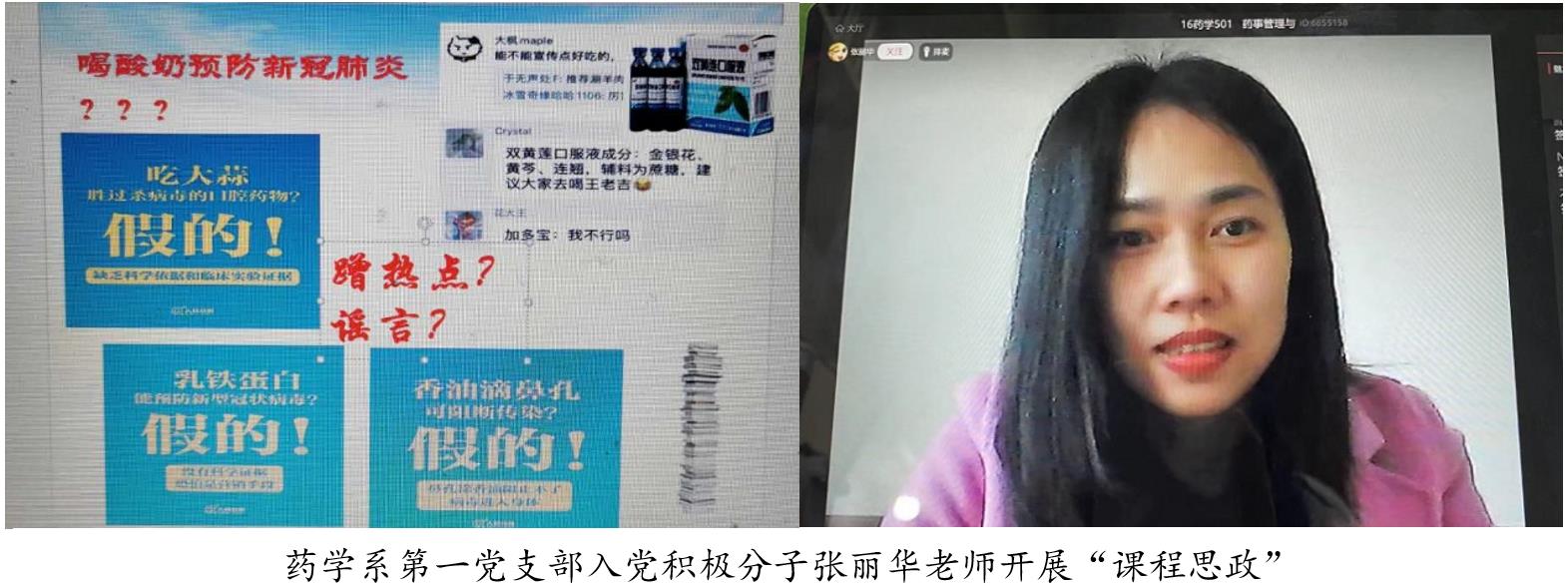 支部黨員大多為專任教師,疫情期間的教學內容雖然和往常相差無幾,可教師突然變身網絡主播,教學場景較之先前發生較大變化,如何幫助他們做好在線教學的教學設計,進而保證在線教學的質量就成為本階段支部的一項重要工作。為此,支委反復溝通,最后定下“直播平臺與學習平臺并用,課中直播為主,課前、課后學習平臺輔助”的在線教學模式,引導支部黨員選擇合適的直播平臺,根據不同課程的特點開展在線教學設計,注重在教學設計中融入疫情防控中的思政素材。《天然藥物學基礎與應用》課程團隊非常重視預習環節的質量,針對每堂課的重要知識點他們都在課前精心錄制若干小微課,講清基礎知識,提出問題,課中她們圍繞問題通過直播開展提問、剖析、考核,教學環節的緊湊讓學生不敢有絲毫懈怠。《中藥商品學》課程團隊則非常重視運用“實物標本的直觀呈現輔以PPT中高清圖片展示”的形式來幫助學生牢固準確地掌握中藥商品的特征,而教學后學生向行業專家提問的積極踴躍則將良好的教學質量充分展現。支部黨員將疫情防控中反映出的“文化自信”、“制度優勢”、“家國情懷”等思政元素和豐富專業知識相互融合,如鹽入水,詮釋了藥學系樣板支部對優秀技能型人才培養的要求。