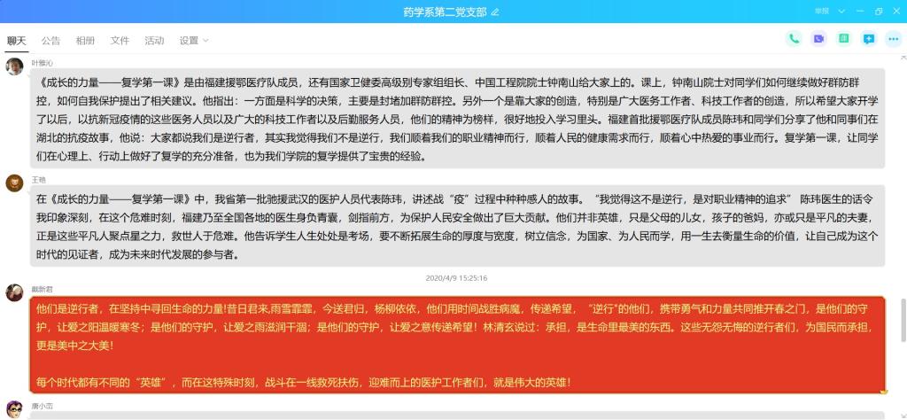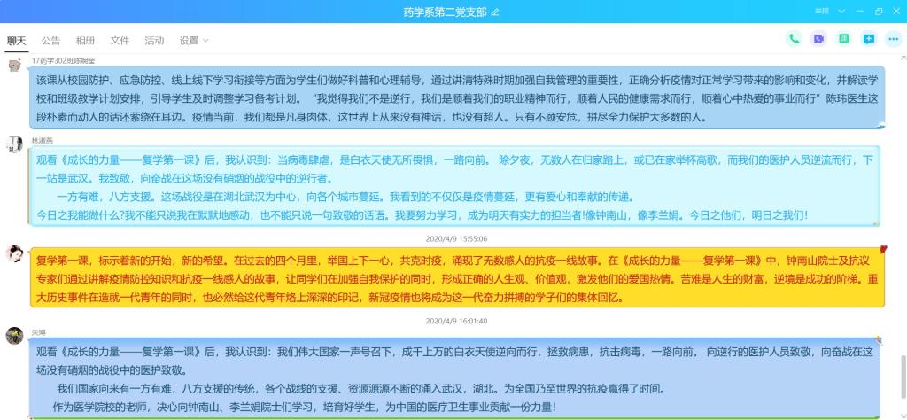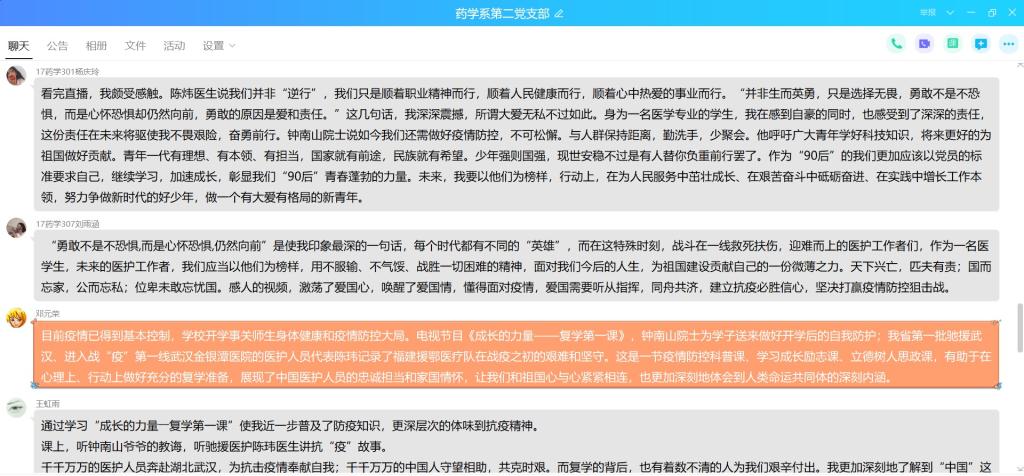 節目結束后,支部成員于線上集合紛紛發表觀后感。這是一節疫情防控科普課、學習成長勵志課、立德樹人思政課,展現了中國醫護人員的忠誠擔當和家國情懷,讓我們和祖國心與心緊緊相連,也更加深刻地體會到人類命運共同體的深刻內涵。同時,作為醫學院校的老師,我們應當積極向鐘南山、李蘭娟院士們學習,培育好學生,為中國的醫療衛生事業貢獻一份力量!