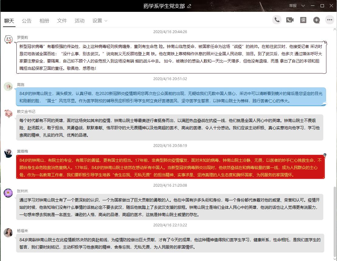 “我想來想去,只不過還是個醫(yī)生”,在疫情防控進入關鍵時刻,4月16日,藥學系學生黨支部通過QQ平臺開展主題黨日活動,集中觀看學習紀錄片《鐘南山》,支部全體師生黨員參與學習。