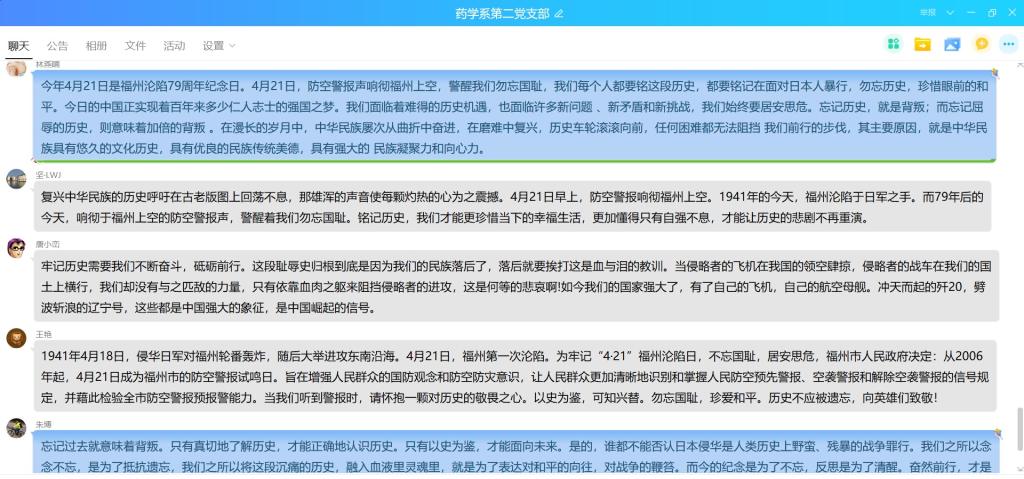 2020年4月21日是福州淪陷79周年紀念日,防空警報響徹福州的上空。為了銘記這段屈辱的歷史,珍惜今天這來之不易的和平,藥學系第二黨支部于4月23日開展“勿忘國恥 珍惜和平”線上主題黨日活動。