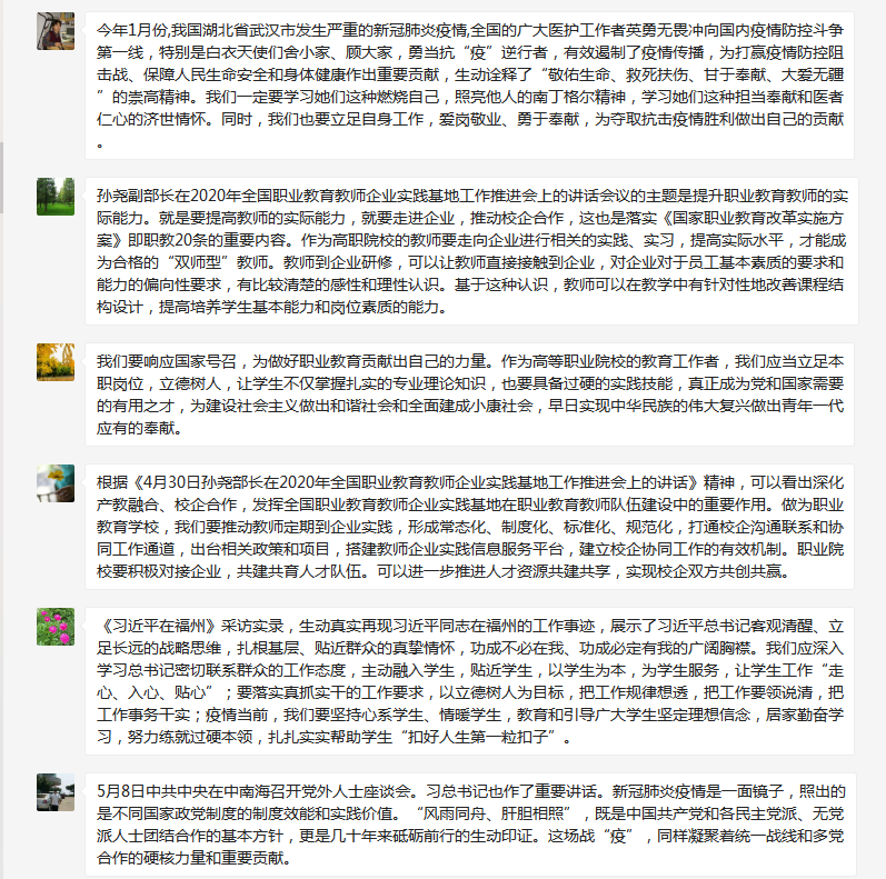 會上,中心組成員集中學(xué)習(xí)了《4月30日孫堯部長在2020年全國職業(yè)教育教師企業(yè)實踐基地工作推進會上的講話》、《習(xí)近平在福州(五)》、《習(xí)近平在福州(六)》、《習(xí)近平總書記在黨外人士座談會上的講話》等內(nèi)容。學(xué)習(xí)過程中,各成員立足崗位實際,發(fā)表心得體會。何舒瀾同志指出孫堯副部長在 2020 年全國職業(yè)教育教師企業(yè)實踐基地工作推進會上的講話突出了一個實字,為“雙師型”教師隊伍的培養(yǎng)指出了明確的方向,高職教師中的“雙師”并不能只是具有雙證的教師,而應(yīng)該是真正有技術(shù)的,能勝任企業(yè)工作崗位的真正“雙師”。鄧元榮同志表示通過學(xué)習(xí)《習(xí)近平在福州》采訪實錄,我們深切地體會到了習(xí)近平總書記視群眾為親人的為民情懷和“馬上就辦、真抓實干”等優(yōu)良作風(fēng),對共產(chǎn)黨人的初心和使命有了更真切、更深刻的感悟,也深切地感受到習(xí)近平總書記對福州建設(shè)的高度重視,他的大局觀和系統(tǒng)思維對開發(fā)區(qū)高質(zhì)量發(fā)展具有戰(zhàn)略性、前瞻性指導(dǎo)意義。