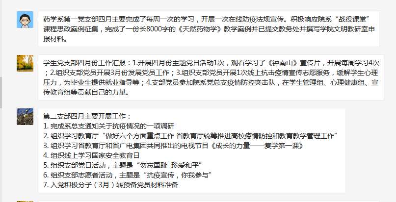 2020年4月30日,藥學(xué)系黨總支在微信群召開(kāi)4月份支部書(shū)記例會(huì),會(huì)議由系黨總支書(shū)記鄭力宏主持。
