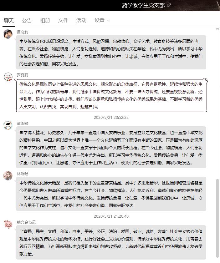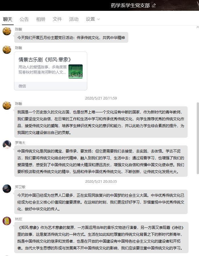 我國是一個歷史悠久的文化古國,也是世界上唯一一個文化沒有中斷的國家。為傳承中華優秀傳統文化,5月21日,藥學系學生黨支部開展線上黨日活動,集體觀看情景古樂劇《鄭風·意象》。