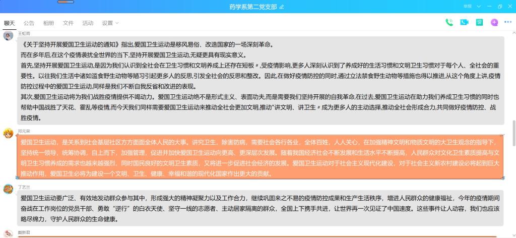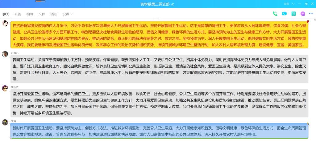2020年6月16日,藥學(xué)系第二黨支部在QQ群開(kāi)展愛(ài)國(guó)衛(wèi)生運(yùn)動(dòng)線上專(zhuān)題學(xué)習(xí)活動(dòng)。本次專(zhuān)題學(xué)習(xí)由支部書(shū)記鄧元榮同志主持。