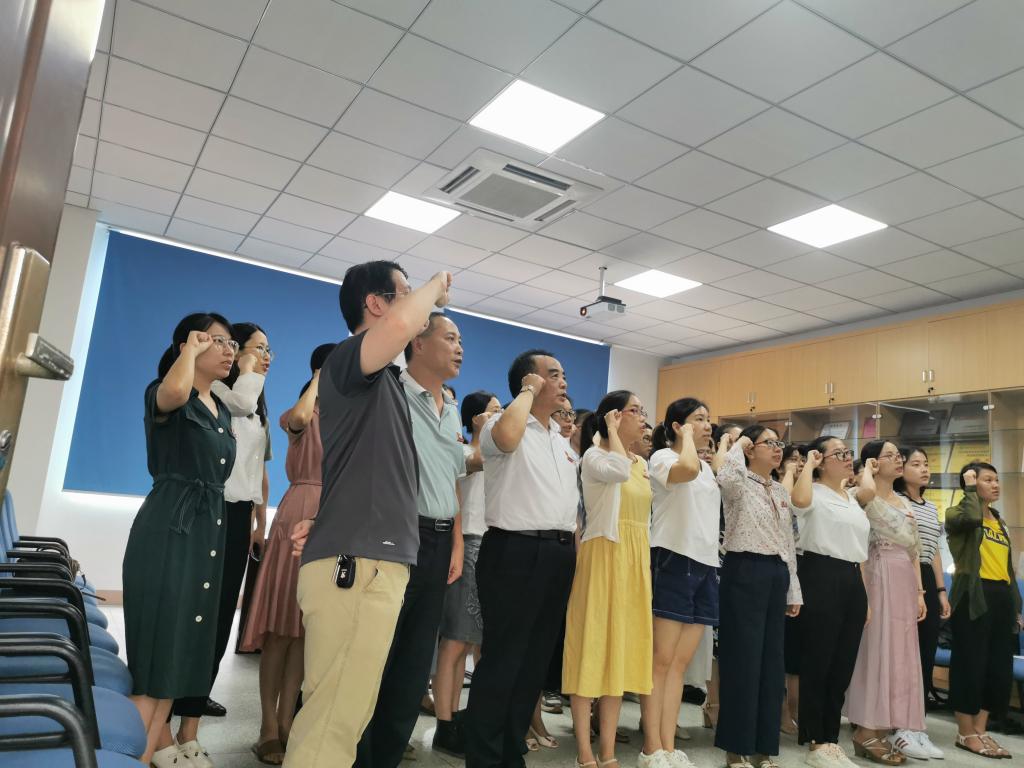 面對鮮紅的黨旗,全體黨員高舉右拳,在總支組織委員何舒瀾同志的帶領下,莊嚴宣誓。鏗鏘有力的誓詞,響徹會場,強烈震撼著每一位黨員的內心。拳頭里握的是信念、是信仰,心中燃起的是對黨的熱愛與忠誠,肩上擔負的是責任與使命。