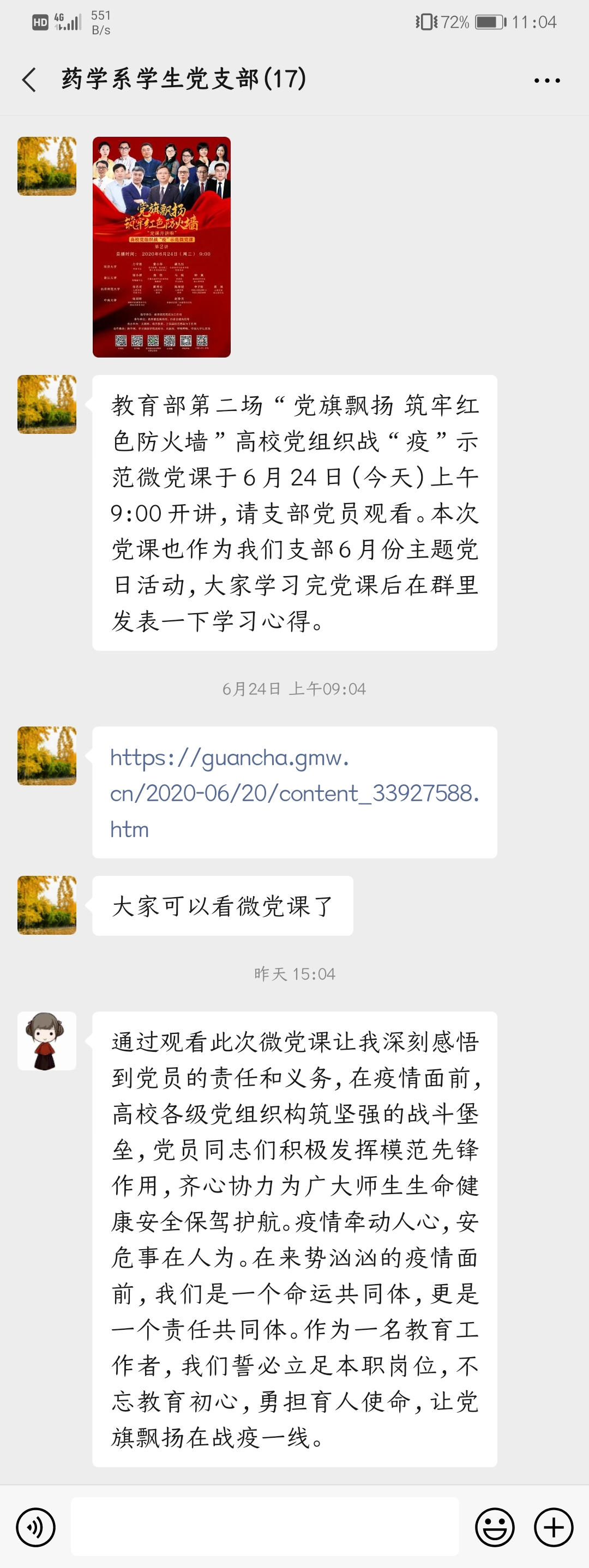6月24日,藥學系學生黨支部通過網絡平臺,開展主題黨日活動,集中觀看教育部“黨旗飄揚,筑牢紅色防火墻”高校黨組織戰“疫”示范微黨課。