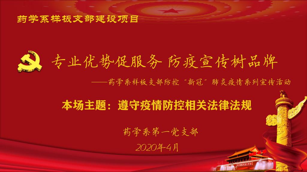 4月19日,藥學系第一黨支部開展線上“遵守疫情防控相關法律法規(guī)”防疫宣傳主題黨日活動,將志愿服務從線下轉為線上,讓服務永不“斷線”。支部全體黨員同志分為5個服務小組,通過網絡平臺為藥學系一至三年級近500名學生開展疫情防控宣傳。