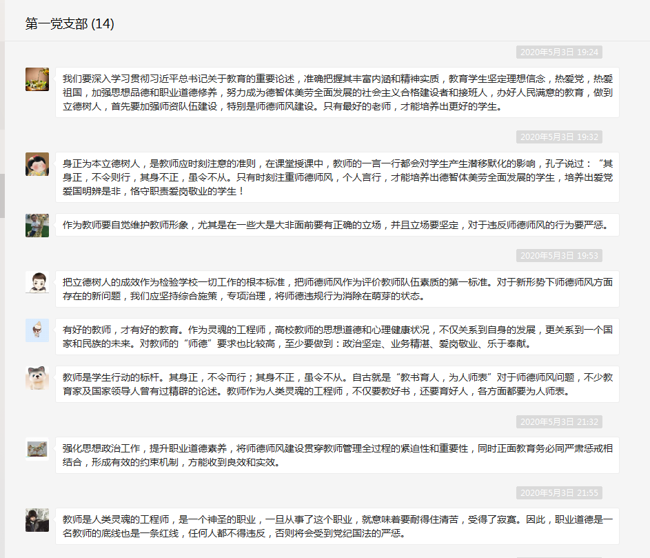 2020年5月3日,藥學系第一黨支部通過微信群在線開展師德師風建設學習活動,本次支部活動恰逢五一小長假,黨員同志在休息的同時不忘學習,認真研讀了《加強師德建設當堅持失責必問》、《教育部強調師德師風第一標準:嚴重違規者將終身禁教》兩篇文章。活動由支部書記何舒瀾主持。