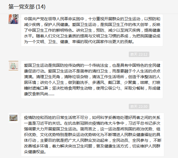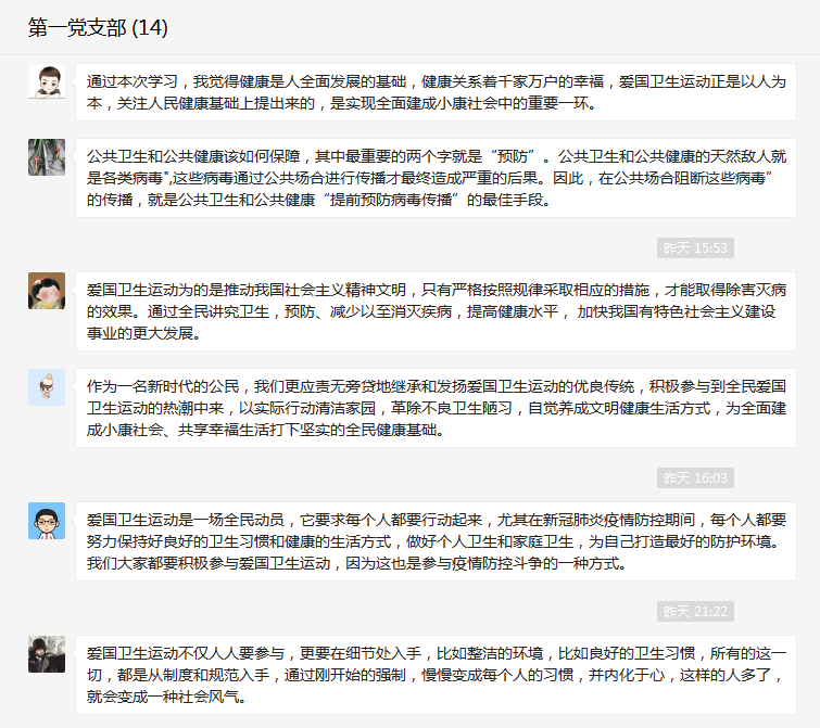 通過交流學(xué)習(xí),黨員同志對(duì)于新時(shí)代開展愛國(guó)衛(wèi)生運(yùn)動(dòng)有了更深刻的認(rèn)識(shí),新時(shí)代開展愛國(guó)衛(wèi)生運(yùn)動(dòng),要堅(jiān)持預(yù)防為主,創(chuàng)新方式方法,從我做起,從身邊的小事做起,倡導(dǎo)文明健康、綠色環(huán)保的生活方式。