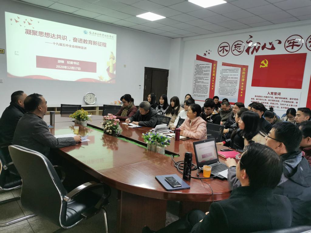 課上,游鋒首先回顧了黨的十九屆五中全會內(nèi)容,并從“辦學(xué)規(guī)模和質(zhì)量不斷攀升、教學(xué)改革成效顯著、智慧校園基本成型、推進(jìn)校內(nèi)外實訓(xùn)基地建設(shè)”等四個方面詳細(xì)闡述了我校教育發(fā)展“十三五”期間取得的顯著成就,最后,立足學(xué)校實際,結(jié)合高水平職業(yè)院校建設(shè)十大工程重點解讀了學(xué)校“十四五”建設(shè)發(fā)展計劃。
