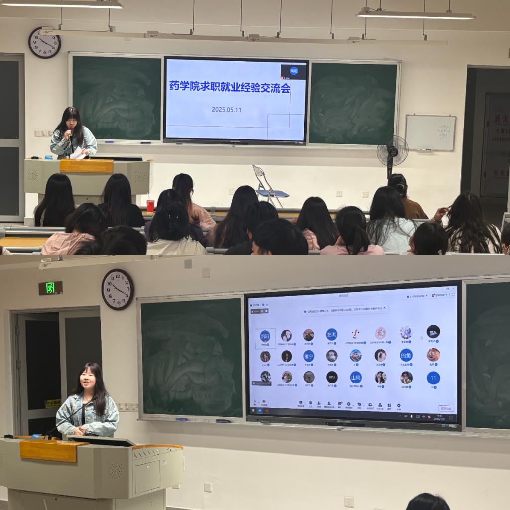 為幫助我院2025屆畢業生精準把握就業形勢,提升求職競爭力,搭建優秀校友與在校生的溝通橋梁,5月11日晚,藥學院第三、第四黨支部舉辦“一站式”學生社區求職就業經驗交流活動。本次活動邀請到兩位2024屆優秀黨員校友李梓茹和陳思琪為即將踏上求職之路的2025屆學生分享寶貴經驗,活動通過線下線上兩個平臺舉辦,氣氛熱烈。