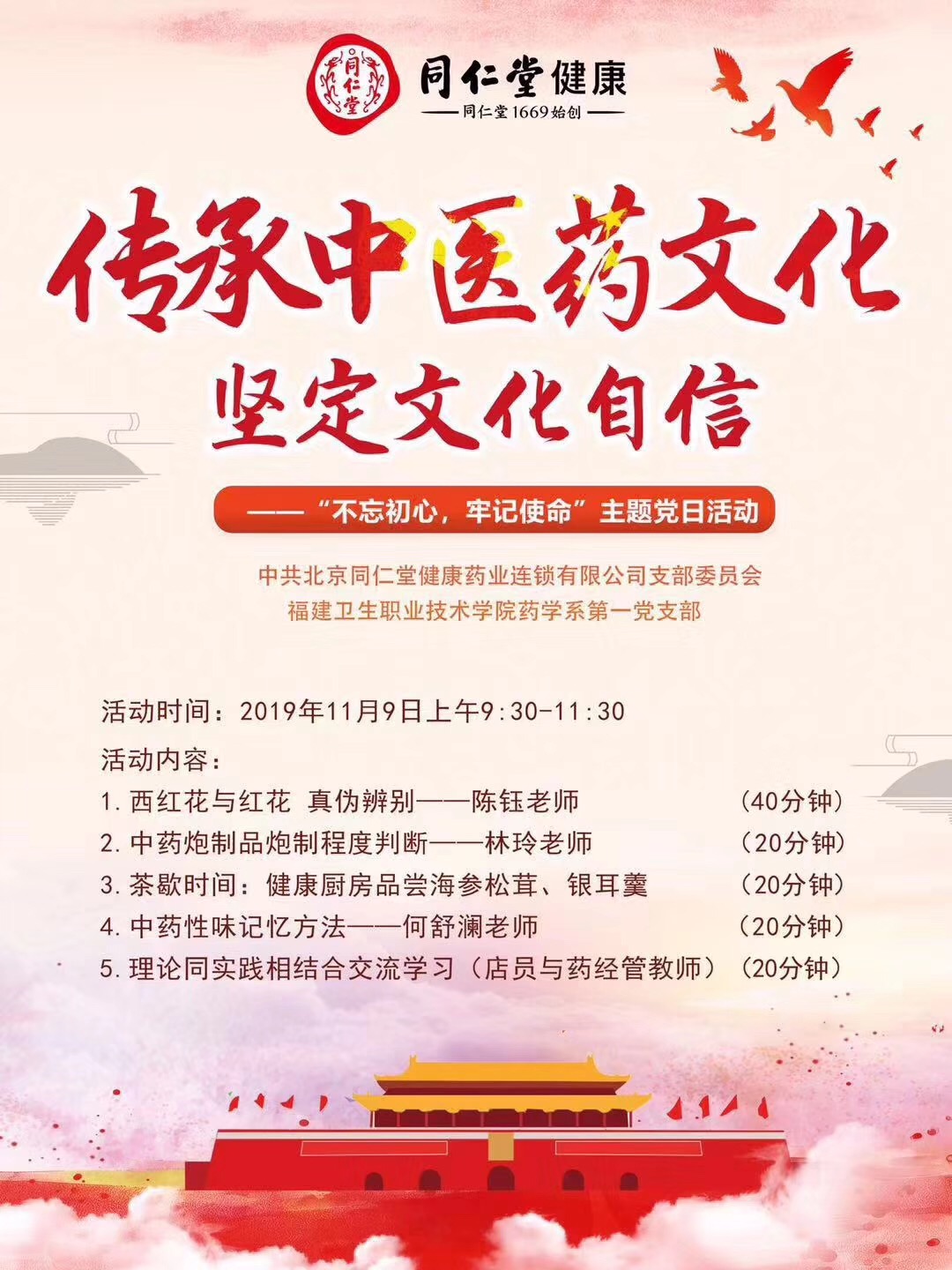 11月9日,一場別開生面的主題黨日活動在北京同仁堂福建藥業(yè)連鎖有限公司福州南星商城藥店拉開帷幕。本次黨日活動的主題是“傳承中醫(yī)藥文化,堅(jiān)定文化自信”,學(xué)院紀(jì)委游鋒書記和藥學(xué)系黨總支鄭力宏書記蒞臨現(xiàn)場,藥學(xué)系第一黨支部全體黨員、北京同仁堂福建藥業(yè)連鎖有限公司的黨員代表和一線員工到場參加。